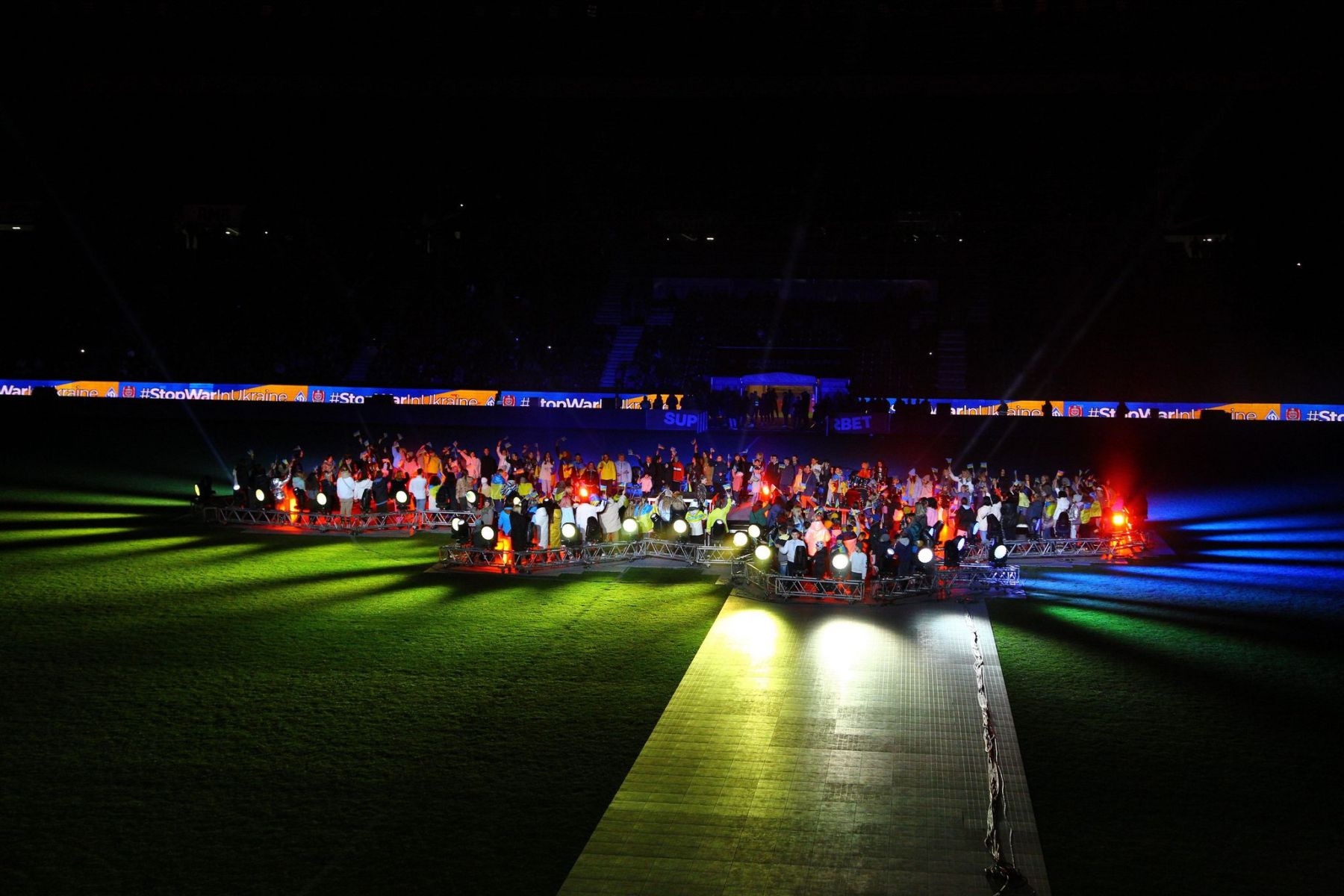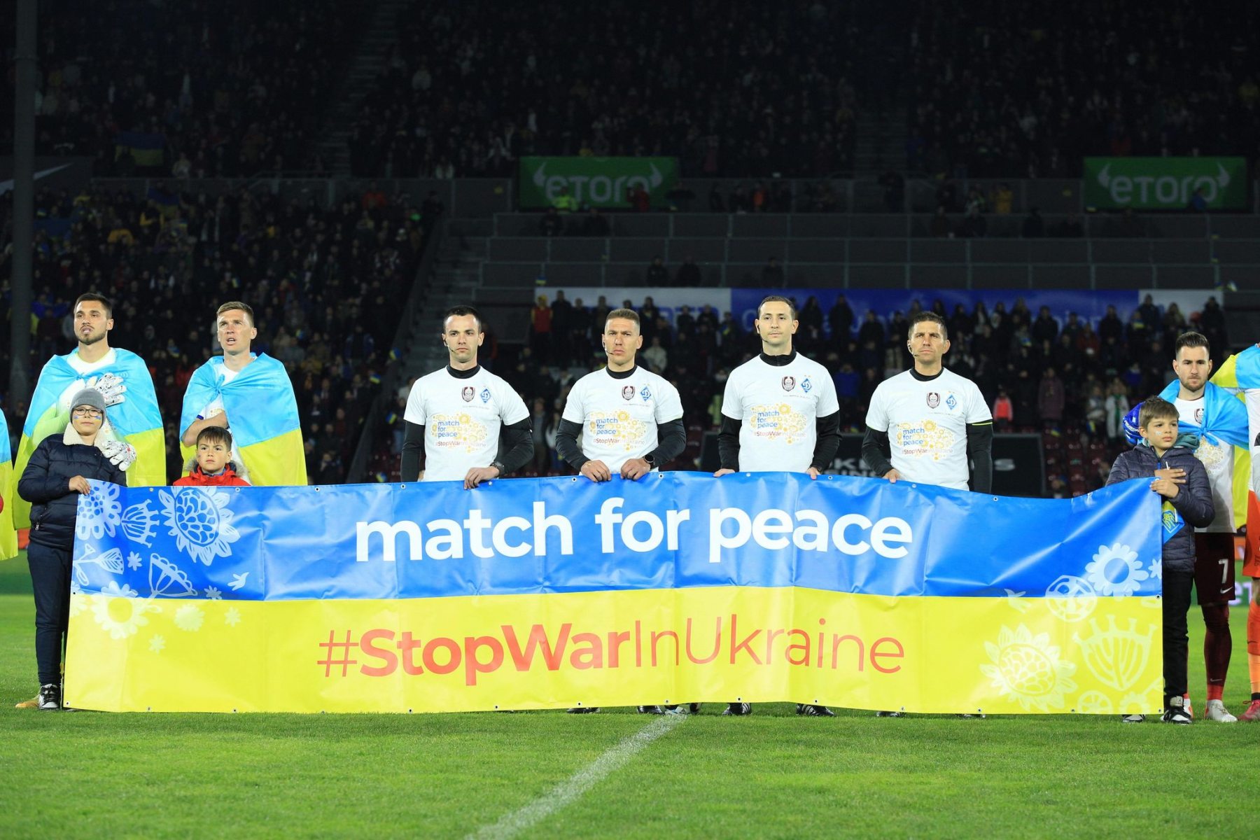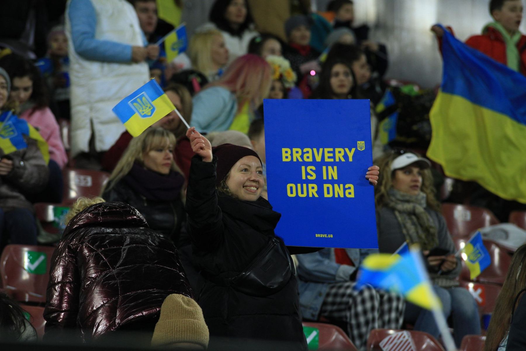 Spectatorii prezentați la această partidă au ridicat steaguri și eșarfe în culorile Ucrainei și au afișat mesaje pentru pace.