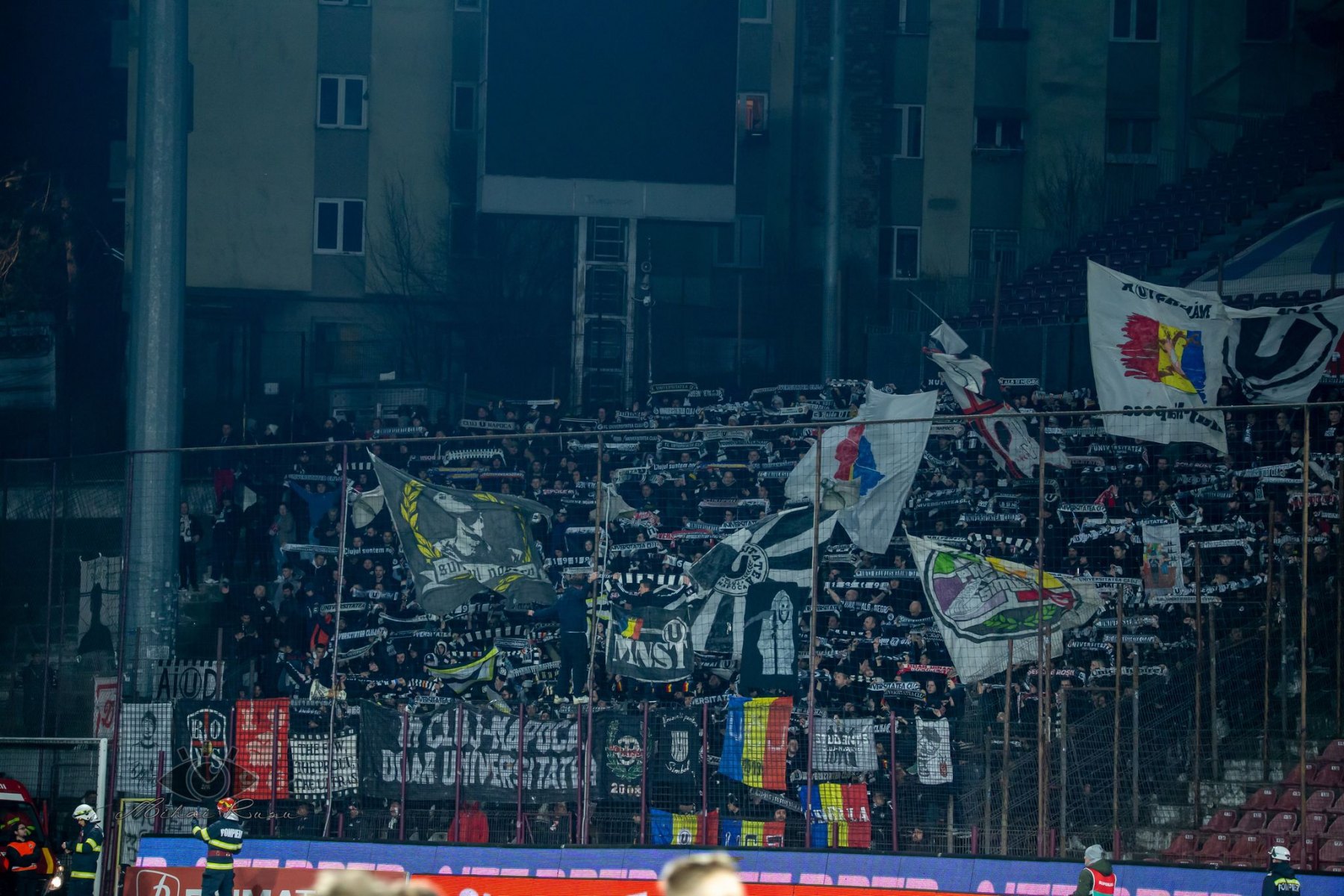 Suporterii Universității și-au făcut simțită prezența pe stadionul din Gruia au aprins torțe și au dat drumul la fumigene și petarde, însă nici fanii lui CFR nu s-au lăsat mai prejos și au umplut sectorul rezervat gazdelor, oferind și ei un joc pirotehnic spectaculos cu fumigene roșii.